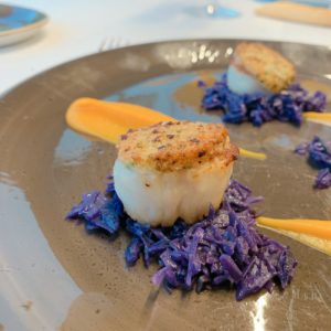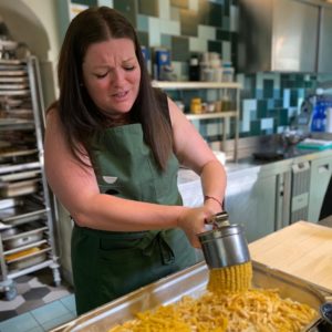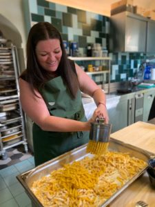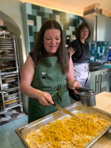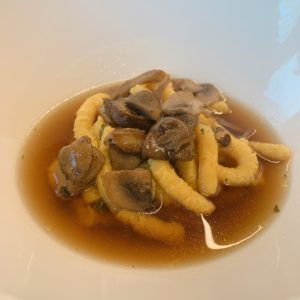 Ce cheffe extraordinaire nous a transmis quelques uns de ses secrets de cuisine. Avec elle, nous avons préparé notre diner et un apéritif à base de parmesan avant de déguster ses plats. Un bouillon de champignons avec des Passatelli au parmesan et un gratin de coquillettes, Saint-Jacques au parmesan, crème de potiron et chou rouge.