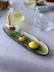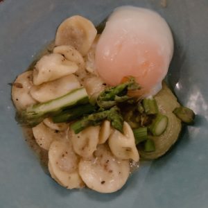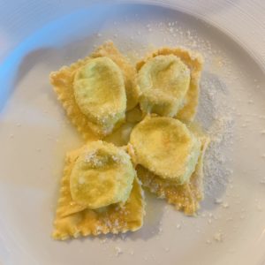 Une cuisine moderne et raffinée où on peut déguster des sushis au parmesan, de la morue accompagnée de caviar et de glace au parmesan, des annolinis d’été avec des œufs pochés et des pousses d’asperges, un sorbet au lambrusco.