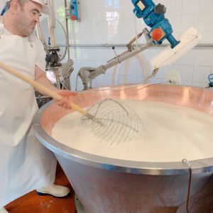 En 1 heure, les grains de caillé forment une masse compacte au fond du chaudron. S’en suit la séparation en 2 du mélange pour les mouler et les laisser égoutter pendant 3 jours.