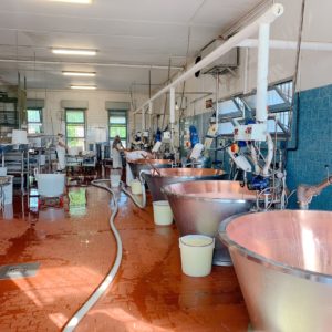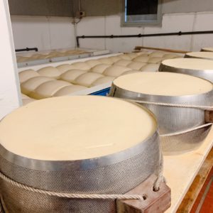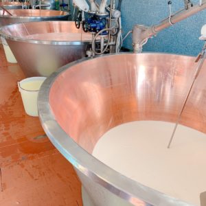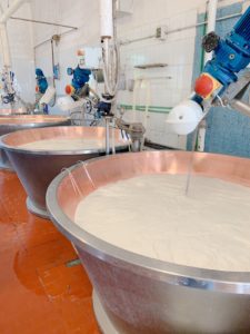 Le lait de vache arrive 2 fois par jour à la fabrique, le matin et le soir après la traite. Le lait et la présure sont chauffés à 55°C pendant 10 minutes. Temps au bout duquel la présure fait coaguler le lait.