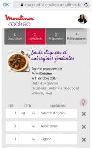 J’ai testé la rédaction d’une recette dans l’application Mon Cookeo. C’est très ludique, il n’y a qu’à suivre les instructions. Je vous l’explique avec quelques photos. Vous pouvez retrouver ma superbe recette de sauté d’agneau et ses aubergines fondantes dans l’application et dites-moi si vous l’avez bien trouvée !