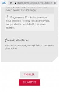 Vous avez vu la nouvelle version de l’application Mon Cookeo ? On peut entrer sa recette directement dessus ! Une superbe avancée technologique. Nous pouvons retrouver les recettes officielles de la marque et chacun d’entre nous peut rédiger sa recette. Cela va permettre, je l’espère, de retrouver un grand nombre de recettes au même endroit.