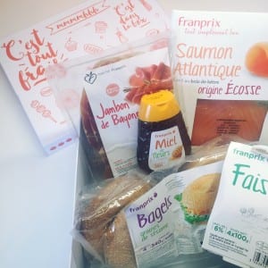 La semaine dernière j’ai reçu la box Franprix regardé la photo ci-dessous. Ils m’ont contacté pour m’envoyer une box surprise et réaliser une recette sur le thème du brunch. Les vacances sont bien là, c’est le moment de prendre son temps et de préparer un bon brunch pour tenir jusqu’au barbecue du soir 🙂 J’adore les brunchs, j’en fait souvent et j’adore y préparer des oeufs cocottes. D’ailleurs avec tout se que j’avais dans la box, j’aurais pu en faire et me servir des bagels comme mouillettes !! Très bonne idée pour la prochaine fois ! J’ai réalisé une recette Bagel au saumon fumé faisselle ail persil qui a fait fureur ! Vous pouvez me donner vos idées de recettes « brunch » que vous aurez réalisé avec cette box (photo ci-dessous)