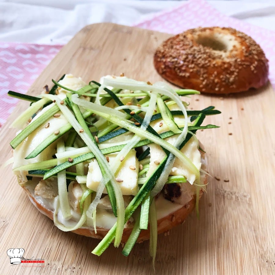 - Coupez vos bagels en deux puis tartinez chaque face de sauce au miel. Sur une des faces, ajoutez le poulet grillé, recouvrez de courgette râpée, déposez des tranches de fromage de Brie, remettez une couche de courgette râpée, saupoudrez de graines de sésame puis terminez par recouvrir du dessus du pain bagel. Régalez-vous !