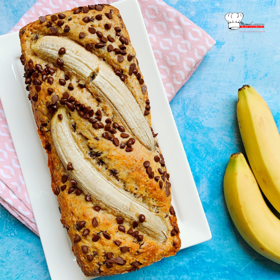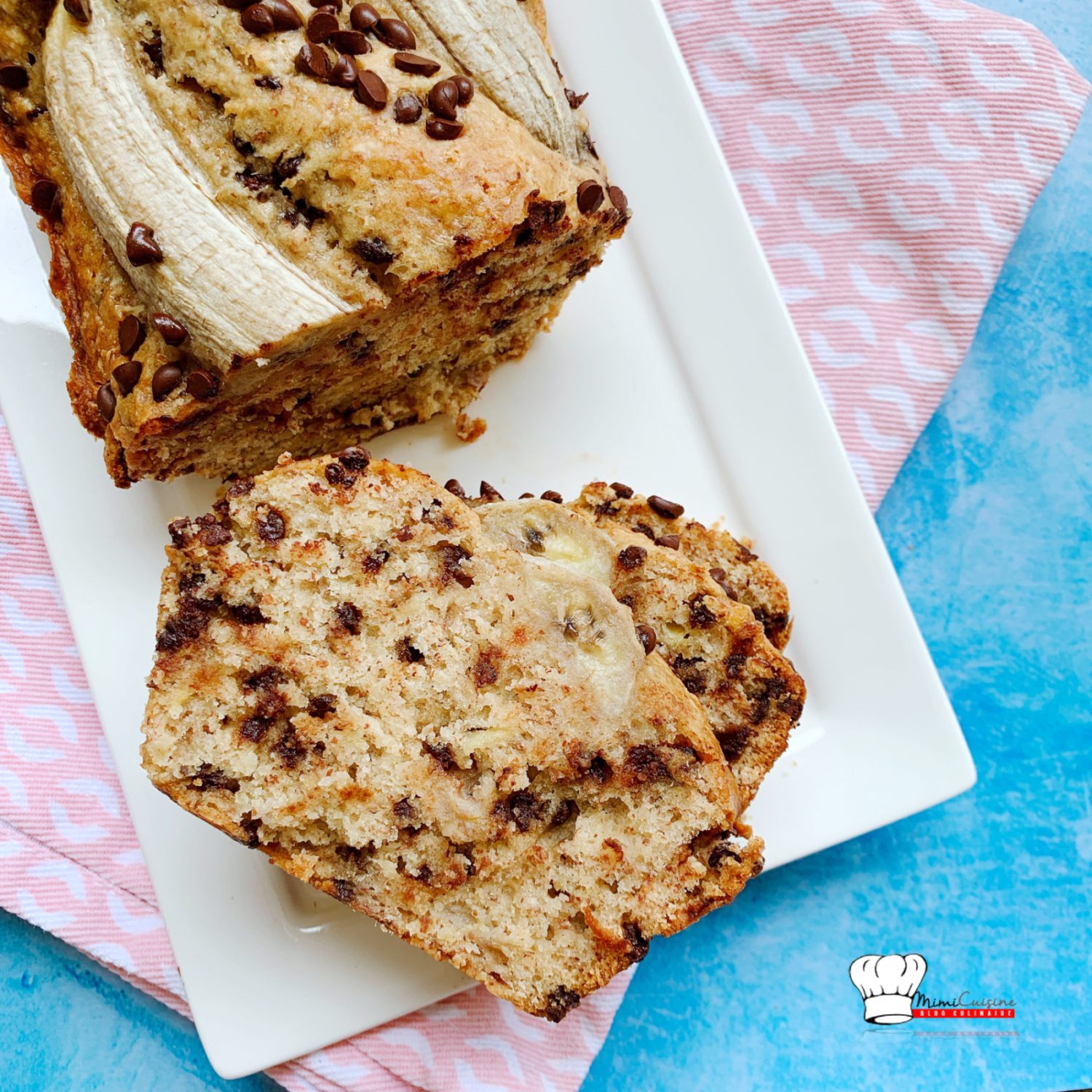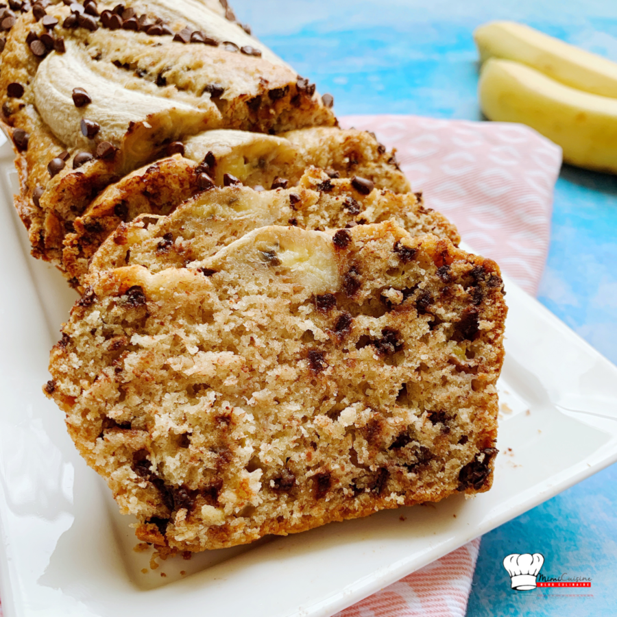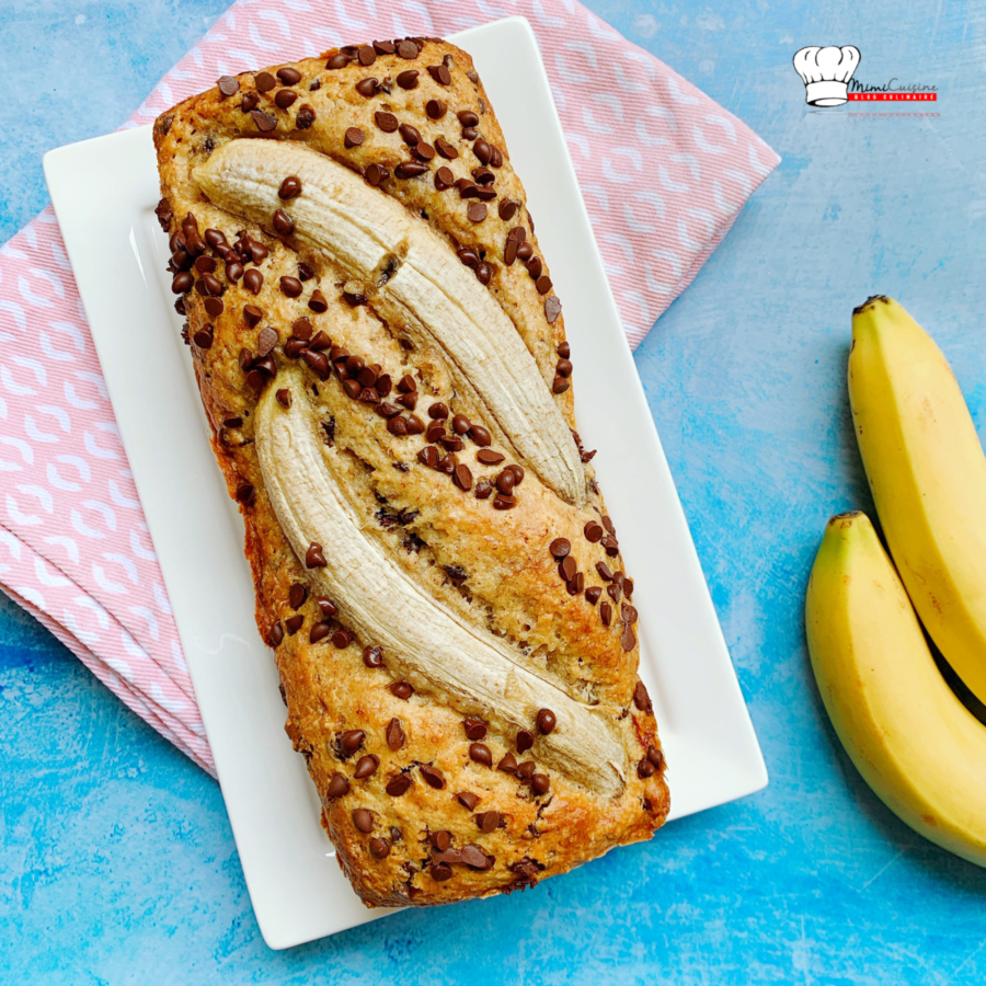 Banana Bread aux pépites de chocolat ou cake à la banane et aux pépites de chocolat ! Il est simple, rapide à préparer et anti-gaspi. Seulement 15 min de préparation et ensuite direction la cuisson pour 45 min. On se pose souvent la question comment recycler des bananes trop mures ? Elles se ramollissent, noircissent et on n’a pu envie de les consommer comme ça. Voici une délicieuse idée recette. Les petits et grands gourmands de la maison vont se régaler. Place à la préparation de ma recette de Banana Bread aux pépites de chocolat.