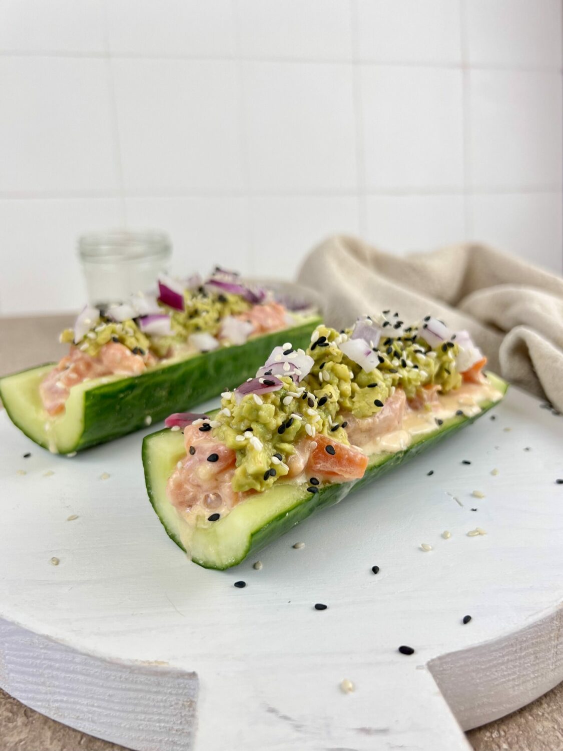 Qui arrive a résister à un concombre, rempli d’une garniture de saumon fumé savoureux et de délicieux morceaux d’avocat crémeux. Le tout est agrémenté d’un filet de jus de citron frais et de quelques herbes fraîches pour une touche de saveur supplémentaire.