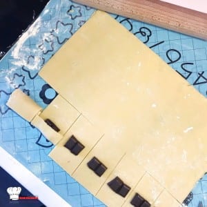 - Découpez des rectangles (voir photo en bas de la recette) puis déposez 2 carrés de chocolat au centre et rabattez les 2 cotés dessus