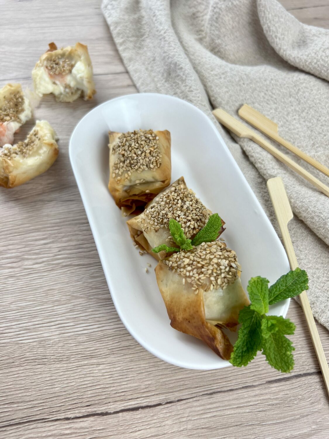 - Découpe la pâte filo en carré et replie chaque morceau de pâte sur la féta.