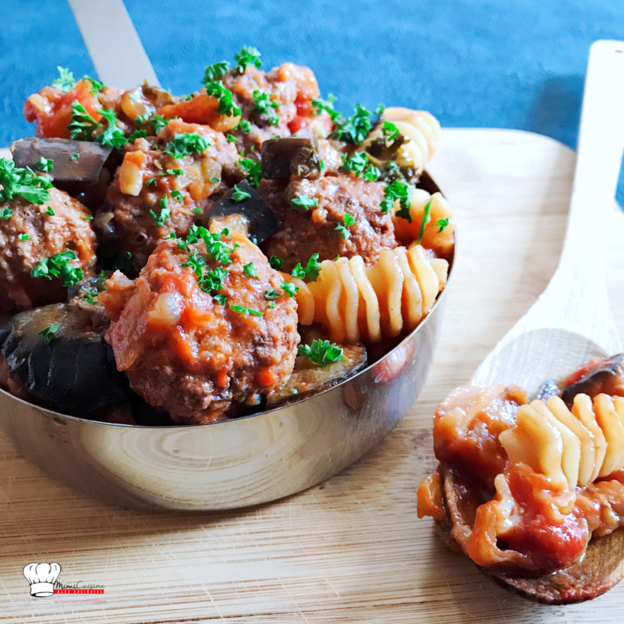 Recette express au Cookeo prête en 20 min pour un délicieux repas aussi bien pour les enfants que pour les parents. Des boulettes de boeuf à faire maison ou à prendre toutes prêtes, des aubergines pour amener des légumes au plat, des pâtes et de la sauce tomate. C’est une recette au Cookeo issue de mon livre « mes recettes de saison au Cookeo » aux éditions Larousse. Place à la préparation de mes Boulettes de boeuf et pâtes à la sauce tomate au Cookeo.