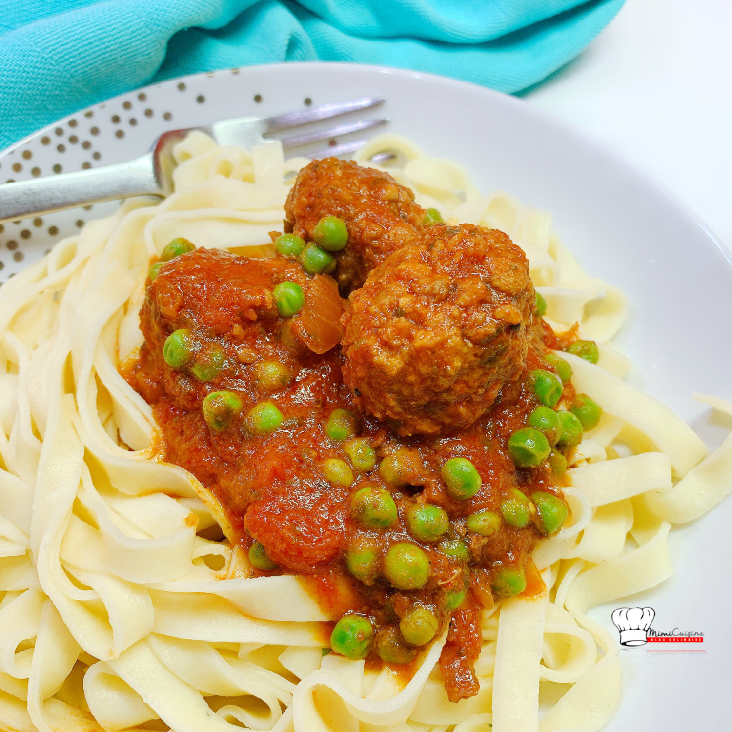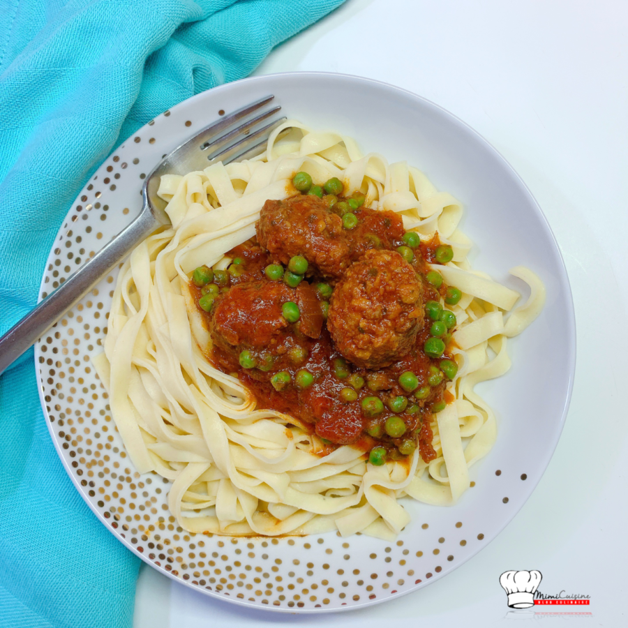 Les boulettes de bœuf c’est ce que mon fils préfère et si je les prépare avec des pâtes alors là c’est le must ! Un plat qui plaira à coup sur aux enfants mais aussi aux parents. Des boulettes à la sauce tomate avec quelques épices. J’ai servi avec des tagliatelles fraîches mais, vous pouvez aussi servir avec du riz ou des pâtes et les cuire directement dans le Cookeo. Pour cela vous ajouter 200 g de riz ou pâtes (longue cuisson c’est mieux) avant de mettre les boulettes dans la cuve et vous remuez bien. Place à la préparation de ma recette de Boulettes de viande et petits pois au Cookeo.