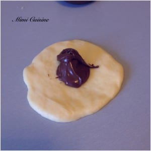 - Séparer des petites boules d'environ 50g, étaler légèrement et fourrer avec une cuillère à café de Nutella.