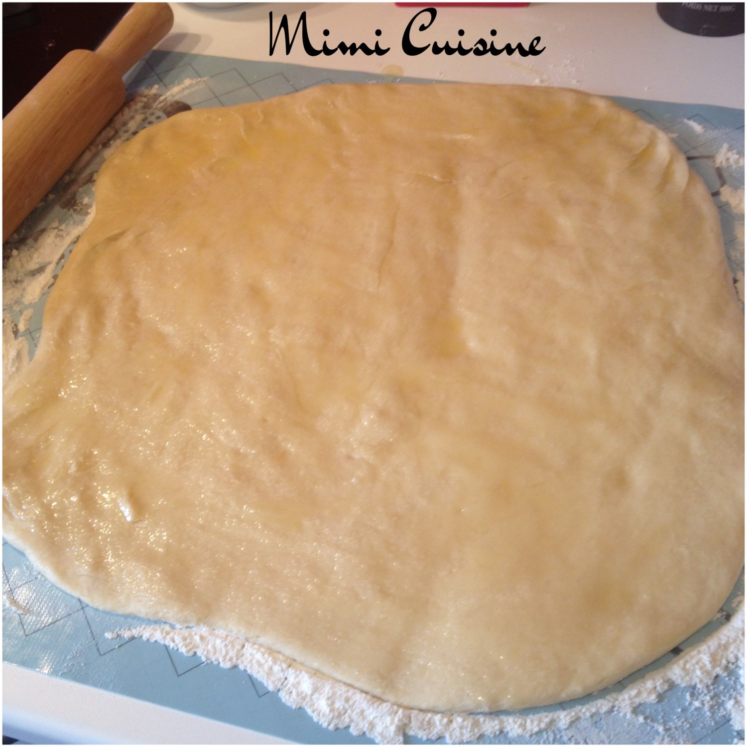 - Étaler la pâte à brioche sur le plan de travail fariné en un grand rectangle (voir photo ci-dessous) et badigeonner du mélange beurre/sucre.