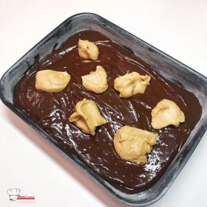 - Dans un plat carré beurré et fariné, mettez un fond de pâte au chocolat puis des tas de pâte au beurre de cacahuète, recouvrez de pâte de chocolat puis remettez des tas de pâte au beurre de cacahuète