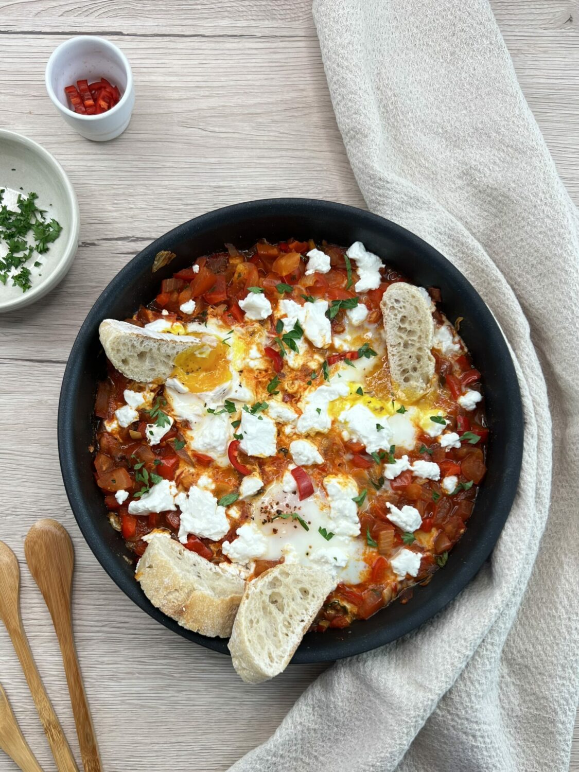 - Sers la chakchouka dans les assiettes, parsème de persil et présente avec le pain.