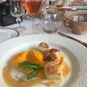 Entrée : Noix de st jacques poêlées – Mousseline de potimarron – Crème de cidre – Cidre rosé