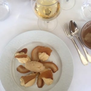Dessert : Sorbet au cidre de glace – Tuile de jus de pomme – Crémeux cidre rosé – Poire poché au caramel – Cidre poire