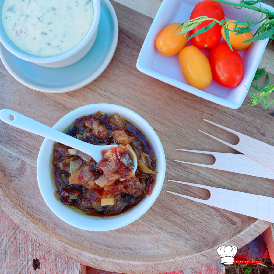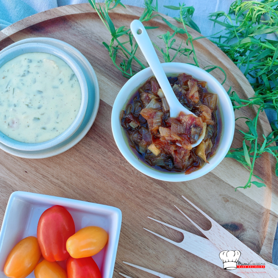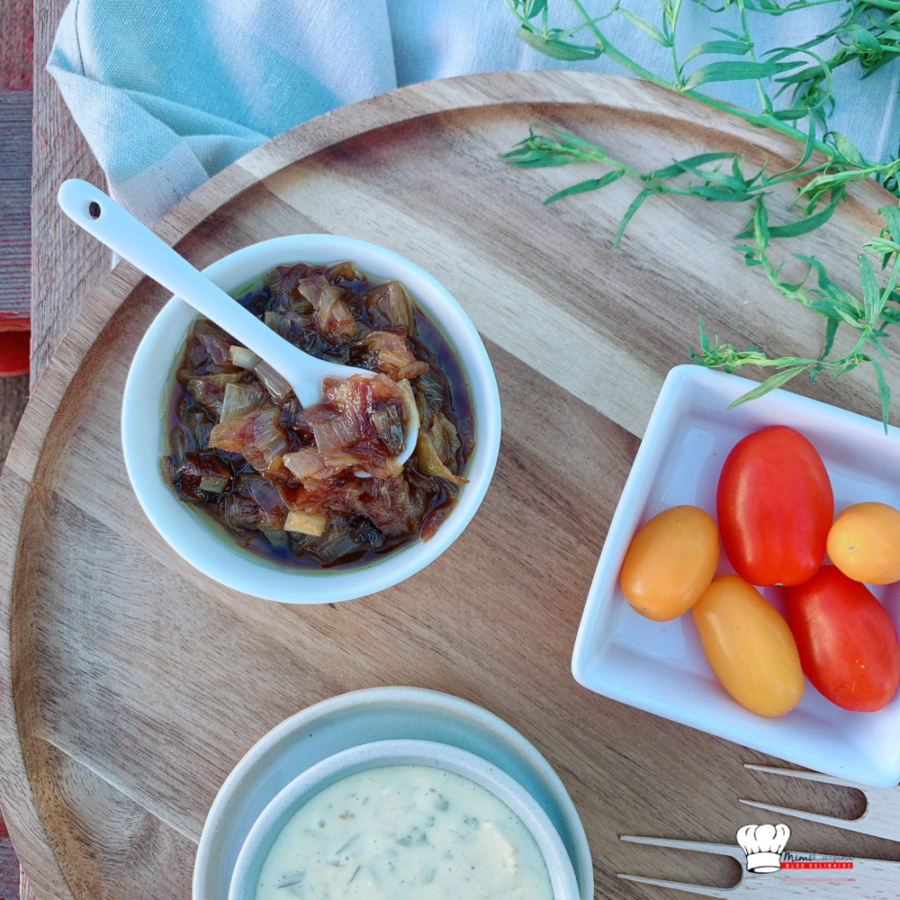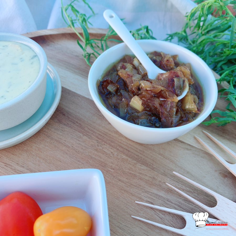 Rien de meilleur que de le faire soi-même. Il vous faut seulement, des oignons, du sucre, du vinaigre, et un filet d’huile d’olive. Vous le préparez à l’avance et vous l’avez à disposition ! J’adore en mettre dans mes hamburgers maison cela donne un gout vraiment exceptionnel et avec la sauce Béarnaise maison cela fait un superbe duo pour mes burgers maison. Place à la préparation de mon Confit d’oignons caramélisé !