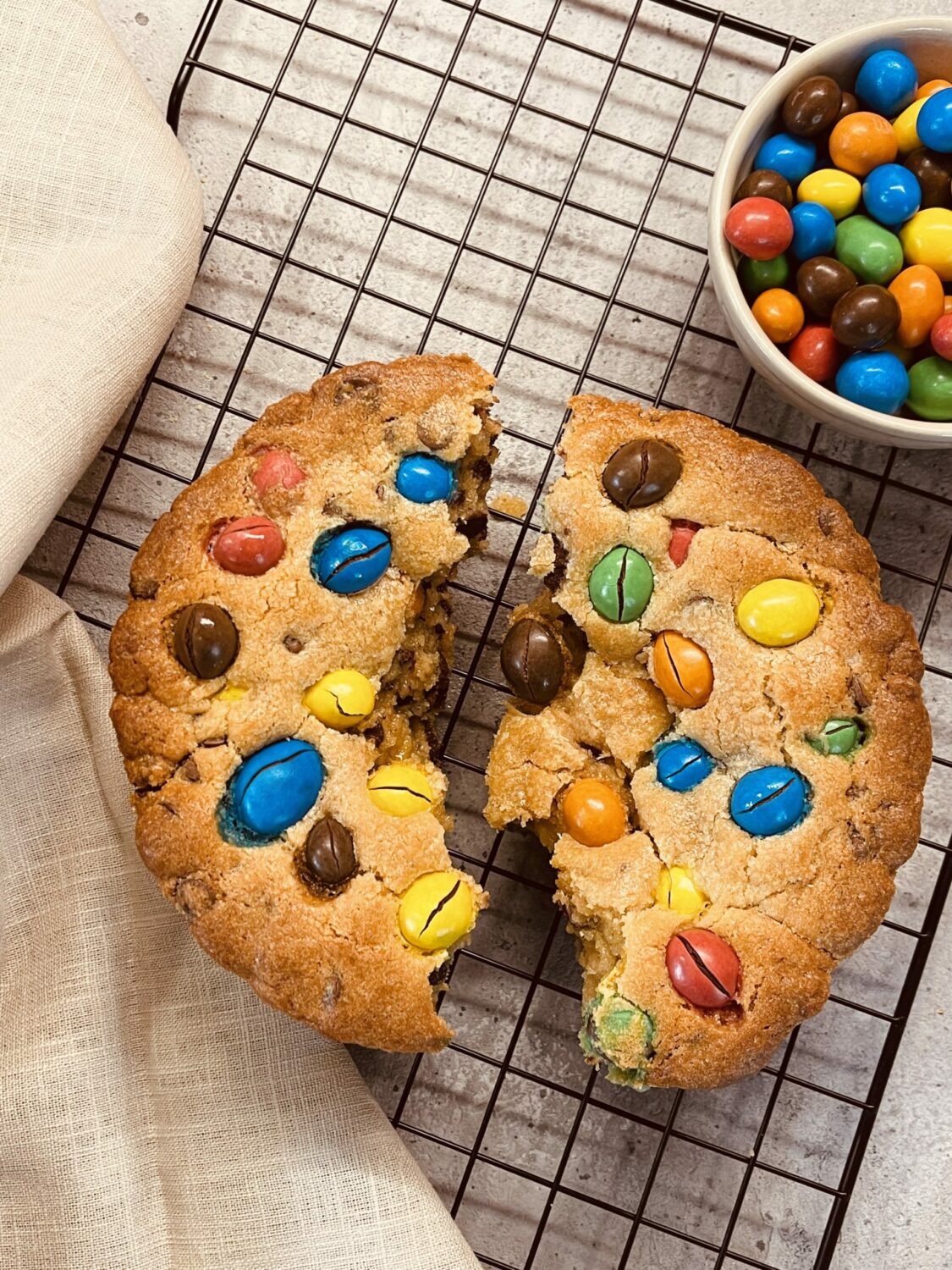 Jour 21 de mon challenge 1 mois dans mon assiette. Je vous propose une recette en exclu de mon livre « Mes Recettes au Cake Factory » aux éditions Larousse Cuisine. C’est un livre rempli de délicieuses recettes pour le gouter avec quelques recettes salées. Je vous laisse découvrir mon Cookie Géant aux M&M’S Recette Cake Factory