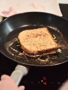 - Chauffer une petite noisette de beurre dans une poêle et y faire griller le croque-monsieur sur