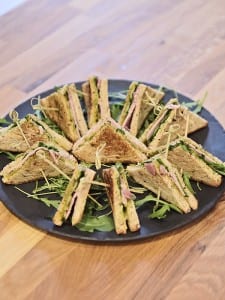 - Une fois griller, couper les croque-monsieur en triangle, les déposer sur une plaque recouverte de papier sulfurisé et les maintenir au chaud dans un four préchauffé à 120° jusqu'à la dégustation.