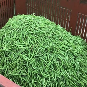 Réalisée avec de gros tracteurs. La machine récolte la plante, et d’un côté garde le haricot et de l’autre rejette les feuilles. Ensuite, transportés à l’usine. Les usines doivent être proche des champs car, pour garder les vitamines, il faut qu’il se soit écoulé moins de 8 heures entre la récolte et la mise en conserve.
