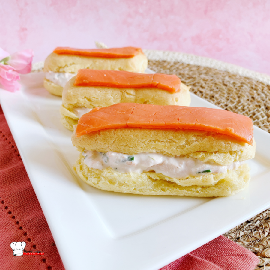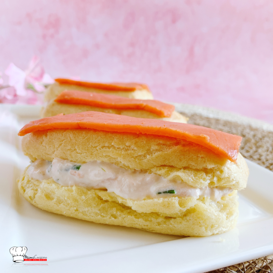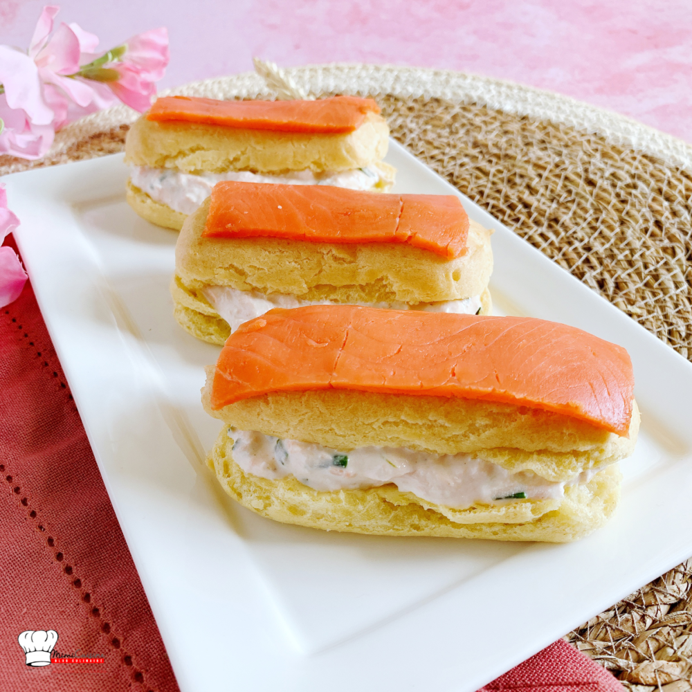 - Découpez le saumon fumé de la taille des choux et placez les morceaux coupés sur le dessus des éclairs