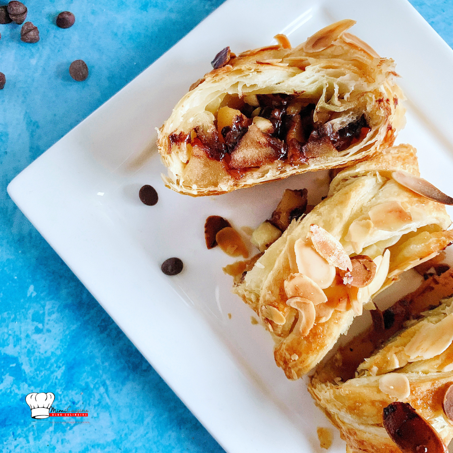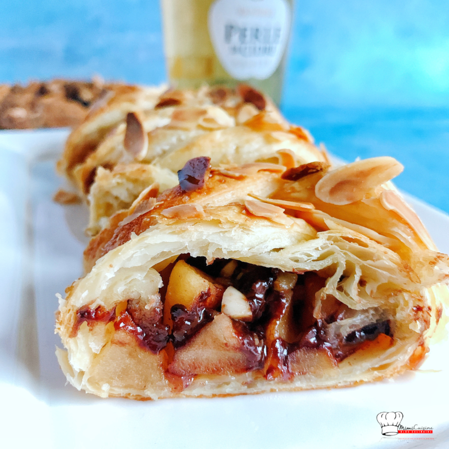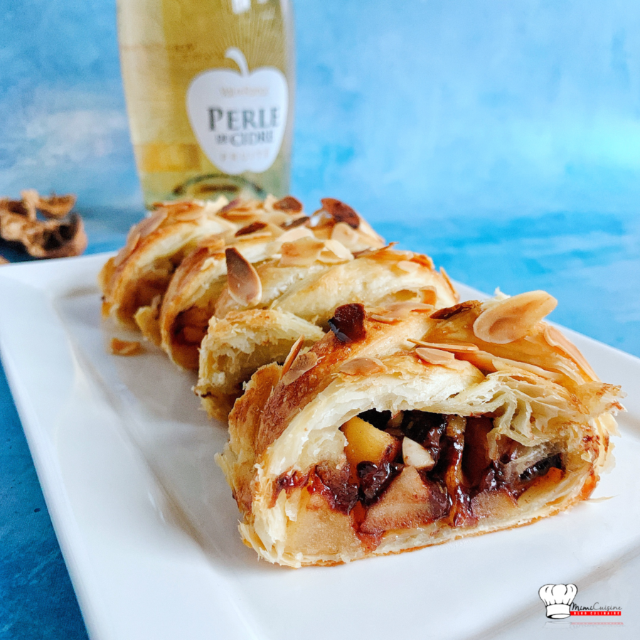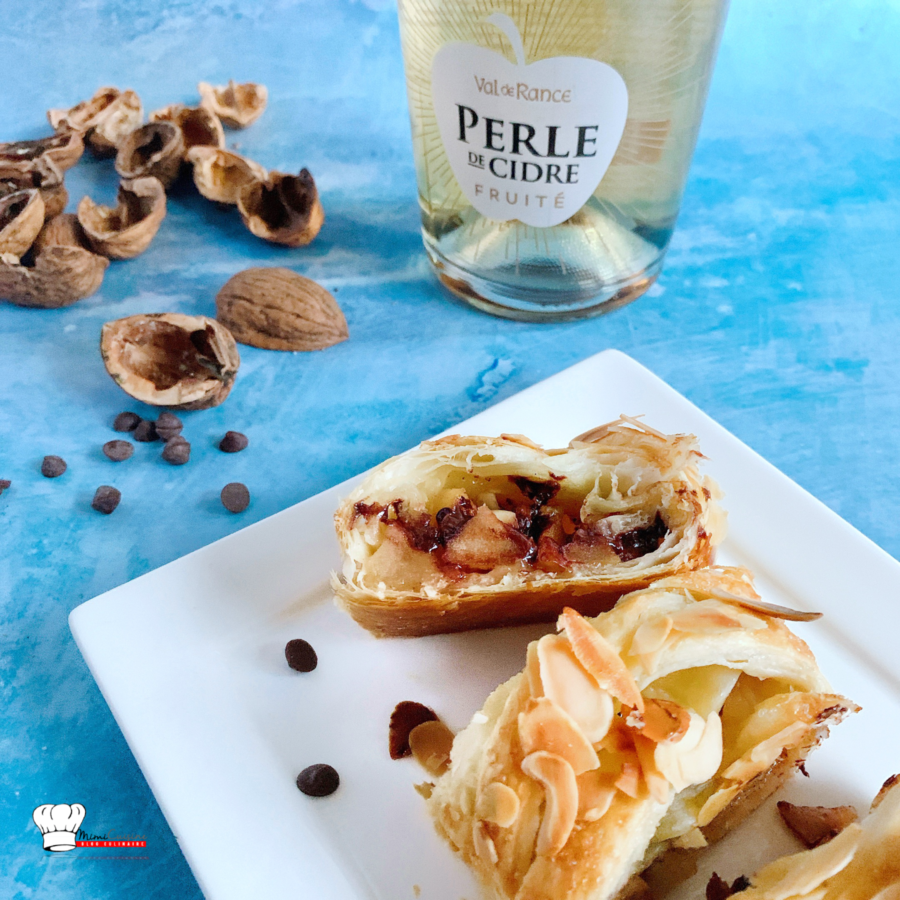 Recette de fin d’année en attendant Noël : Un merveilleux feuilleté aux pommes cannelle et pépites de chocolat avec quelques noix et amandes pour apporter du croquant et du miel pour donner de la douceur. La maison Val de Rance m’a demandé d’élaborer une recette pour les fêtes de fin d’année afin accompagner le Perle de Cidre fruité.