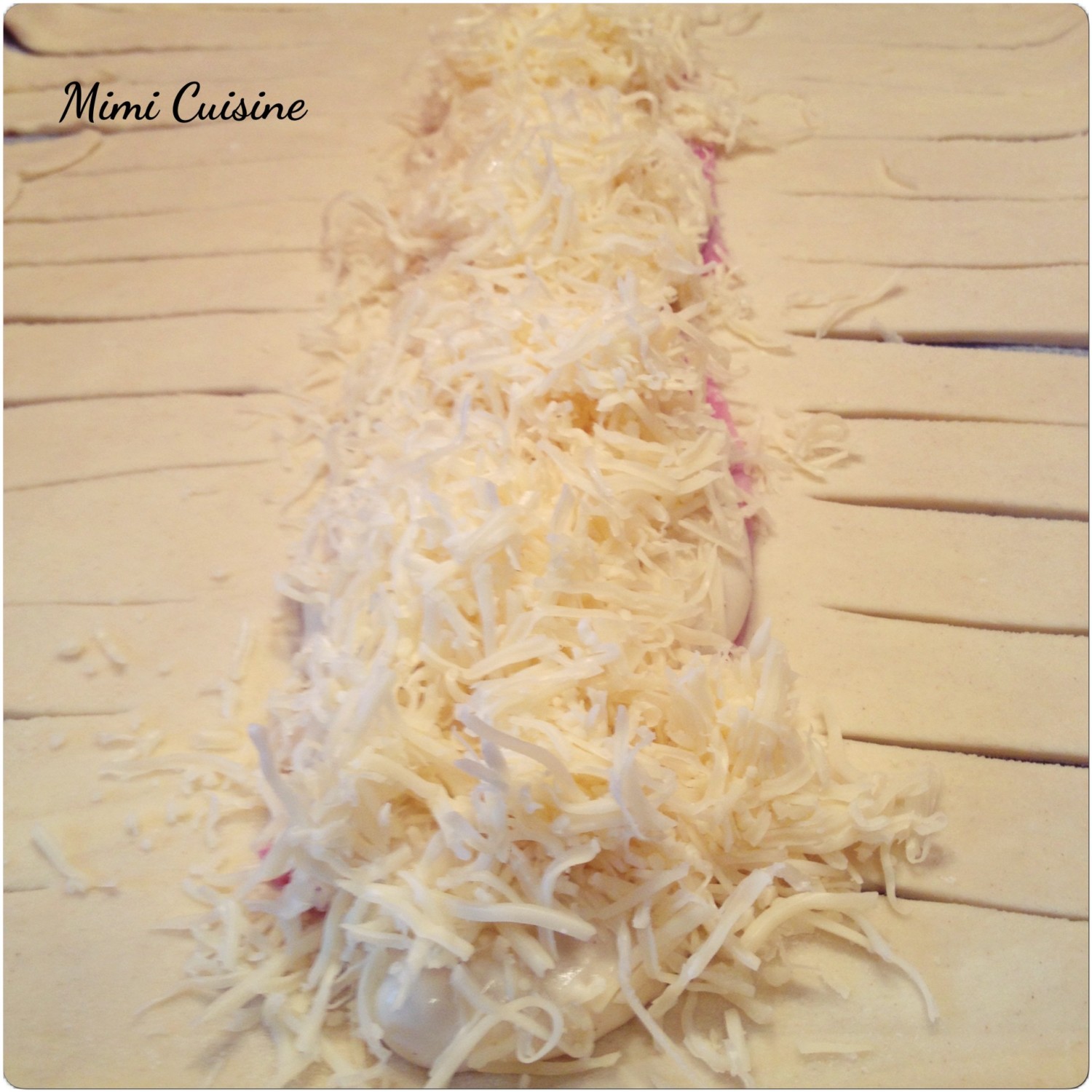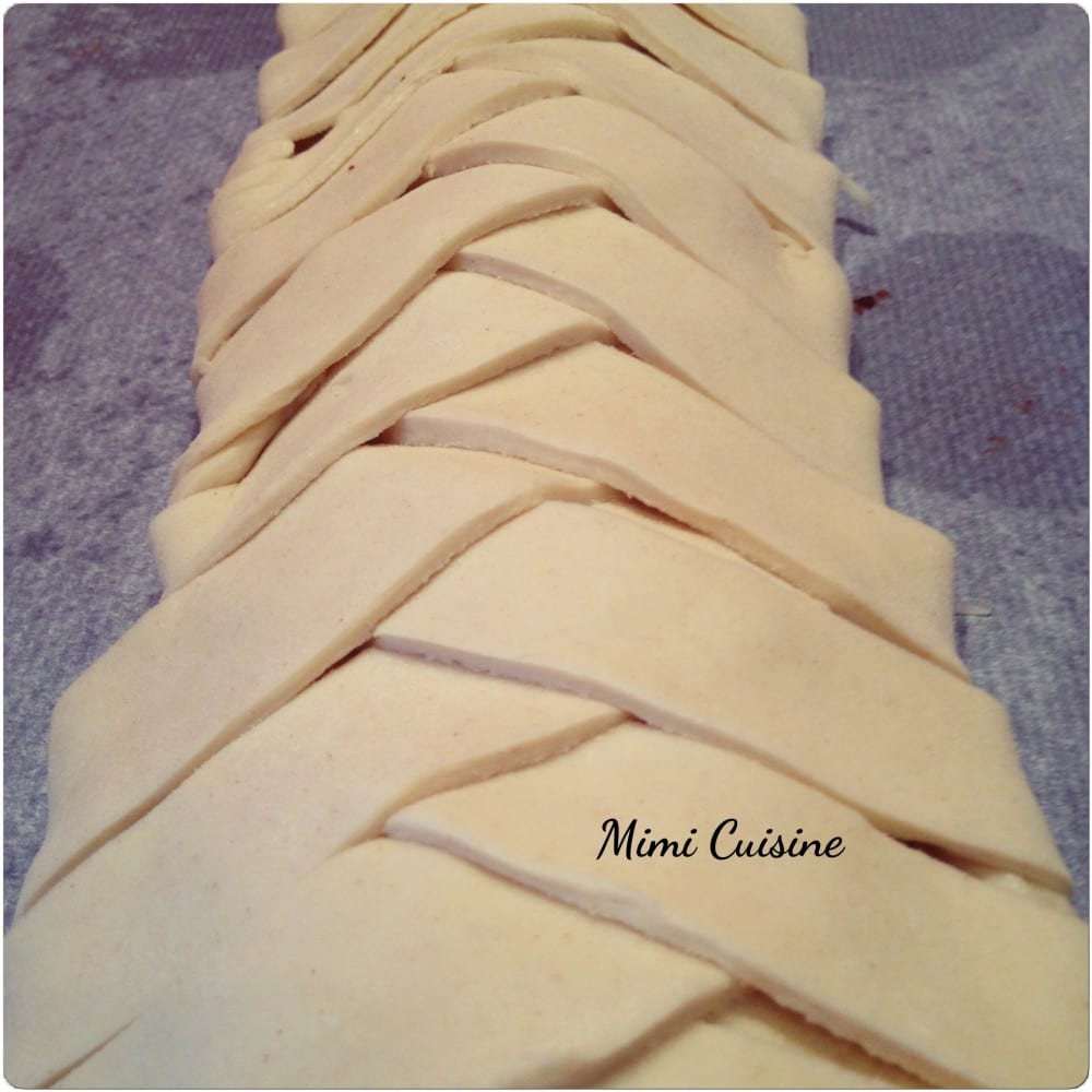 - Rabattre le haut de la pâte sur le râpé puis tresser en ramenant une bande au centre, alternant droite et gauche et en les croisant
