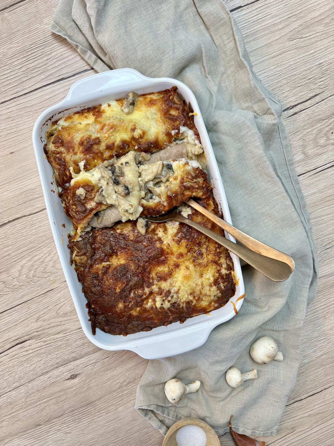 - Transvasez la moitié de la béchamel dans un saladier et ajoutez-y la préparation aux champignons. Salez et poivrez. Mélangez bien.