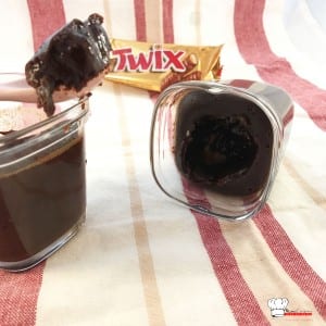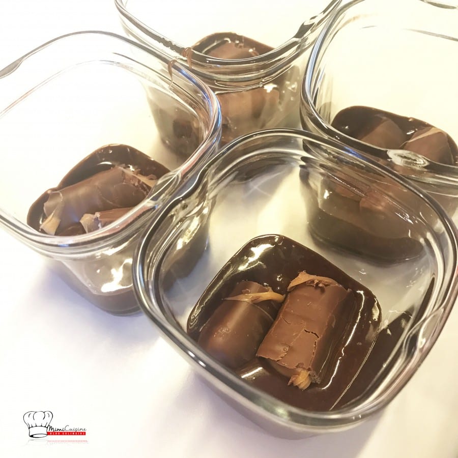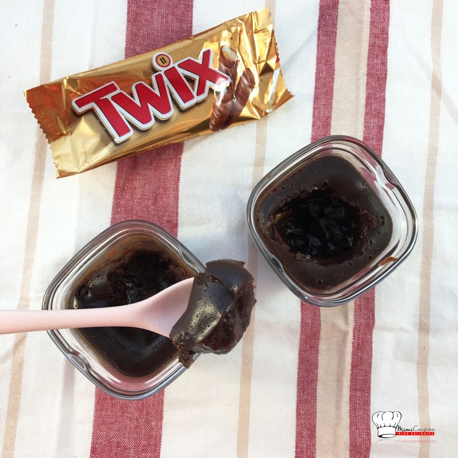 - Remplissez les pots à ⅓ de leur contenance puis insérez 2 morceaux de Twix puis remplissez chaque pot de la préparation au chocolat