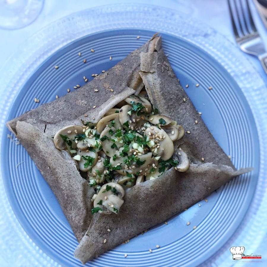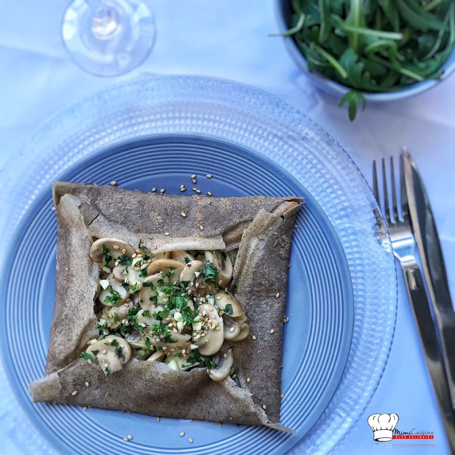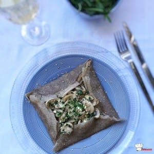 - Au centre de la galette, déposez la préparation aux champignons LOU, repliez les côtés de la galette puis placez-la dans une assiette. Parsemez de graines de sésame et servir avec une salade verte. Recommencez l’opération avec la 2ème galette de sarrasin.