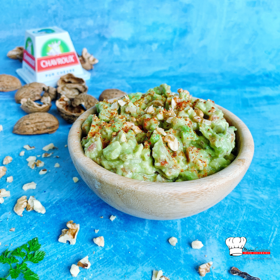 En grande fan d’avocat et de fromage, je vous ai concocté une superbe recette à base d’avocats, de chèvre frais mais aussi de tomate, noix et de piment d’Espelette. Des associations d’épices et de douceur. J’utilise souvent le chèvre frais Chavroux en tartinable, je le remplace au beurre dans mes sandwichs mais, également, dans ma cuisine avec sa texture crémeuse cela permet à une sauce d’être plus onctueuse ou cela permet, aussi de pimper un velouté. On peut utiliser ce produit de plein de façons, en recettes chaudes ou en recettes froides comme par exemple un avocado taost. Vous tartinez une tranche de pain de campagne avec du chèvre frais puis, vous mettez quelques tranches d’avocats et vous parsemez de miel et de persil. Je vous ai donné envie ! Allez, maintenant, place à ma recette de Guacamole Avocat Chèvre Frais et vous m’en direz des nouvelles.