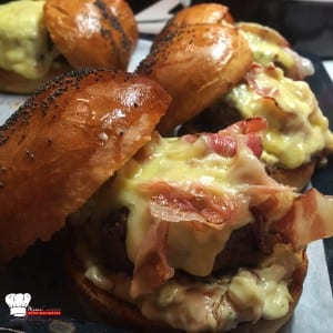 - Tartiner les buns de sauce puis ajouter une bonne cuillère à café d'oignons caramélisés puis y déposer les steaks et finir par la fromage fondu puis la poitrine fumée