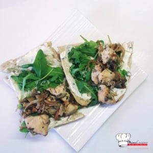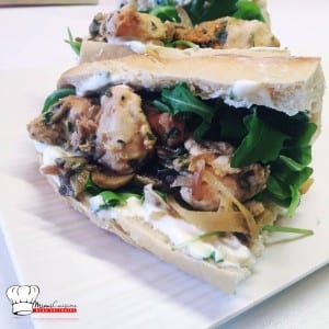 - Étaler la sauce sur le pain puis ajouter un peu de roquette puis ensuite poulet et champignons.