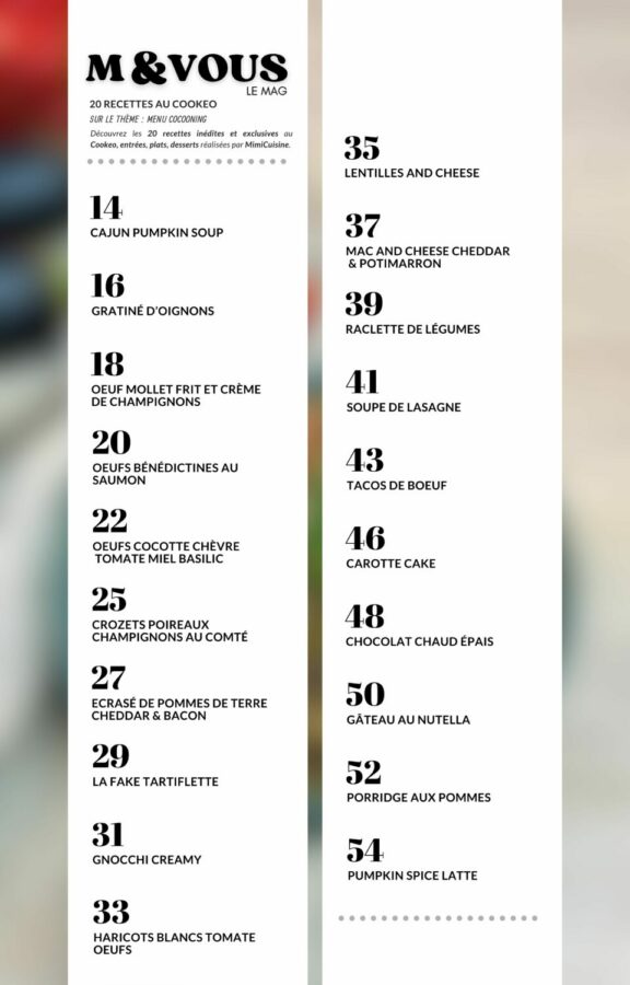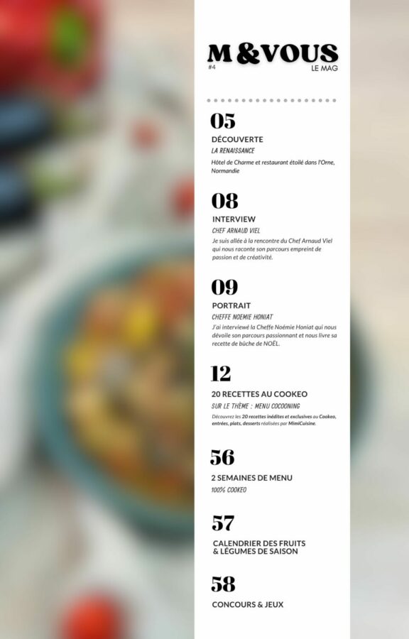 Amateurs de cuisine, préparez-vous à embarquer dans une aventure culinaire unique avec M&Vous, le mag. Ce magazine digital, conçu pour inspirer et régaler, propose des recettes exclusives spécialement pensées pour le Cookeo. Que vous soyez adepte des repas rapides ou des plats savoureux et réconfortants. Chaque numéro regorge d’idées pour simplifier votre quotidien tout en mettant les petits plats dans les grands. Cliquez ici pour en savoir plus sur les premiers numéro de M&Vous, le mag.