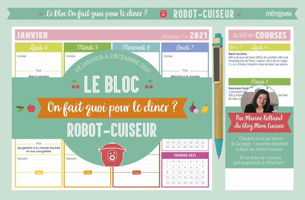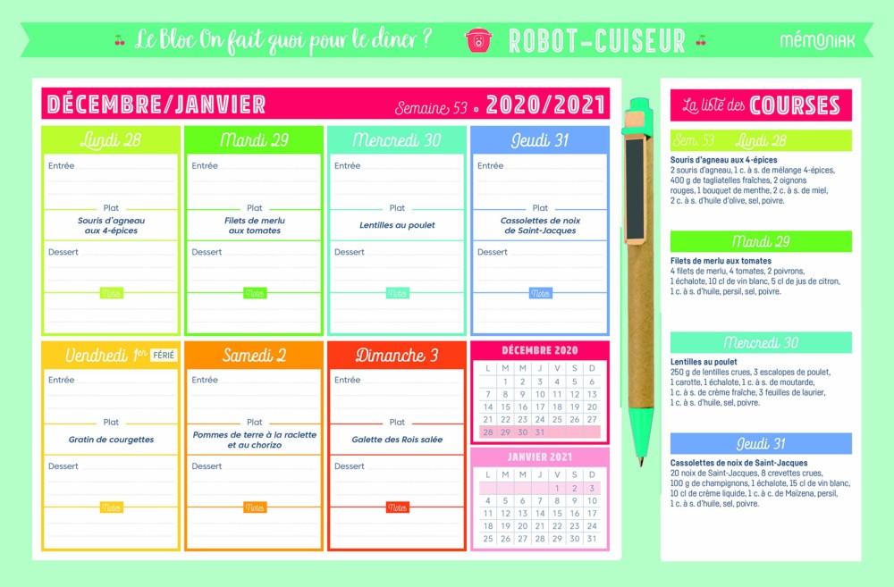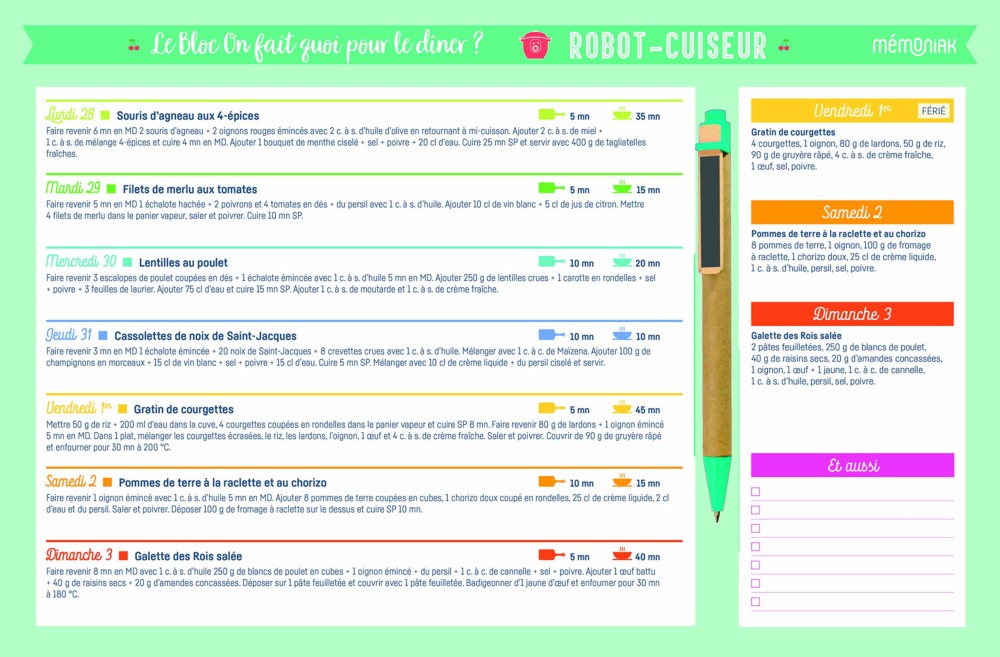 Des idées de recettes de plats à faire au robot-cuiseur pour chaque jour de la semaine ainsi que des espaces pour noter ses idées d’entrées et de desserts !