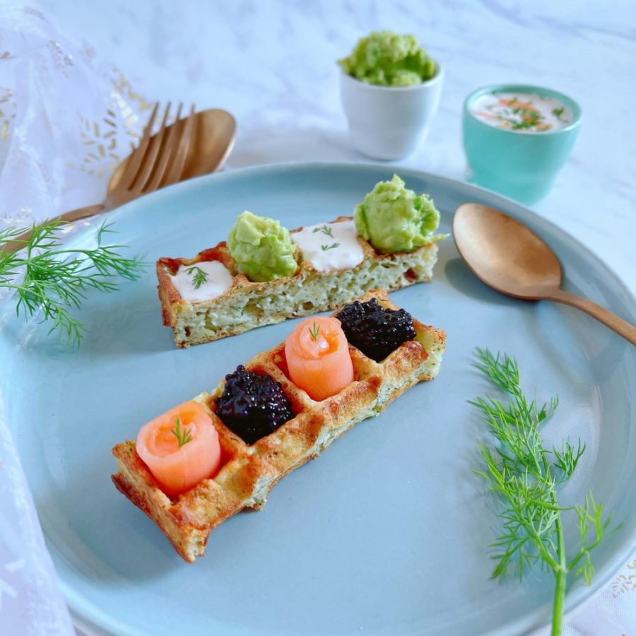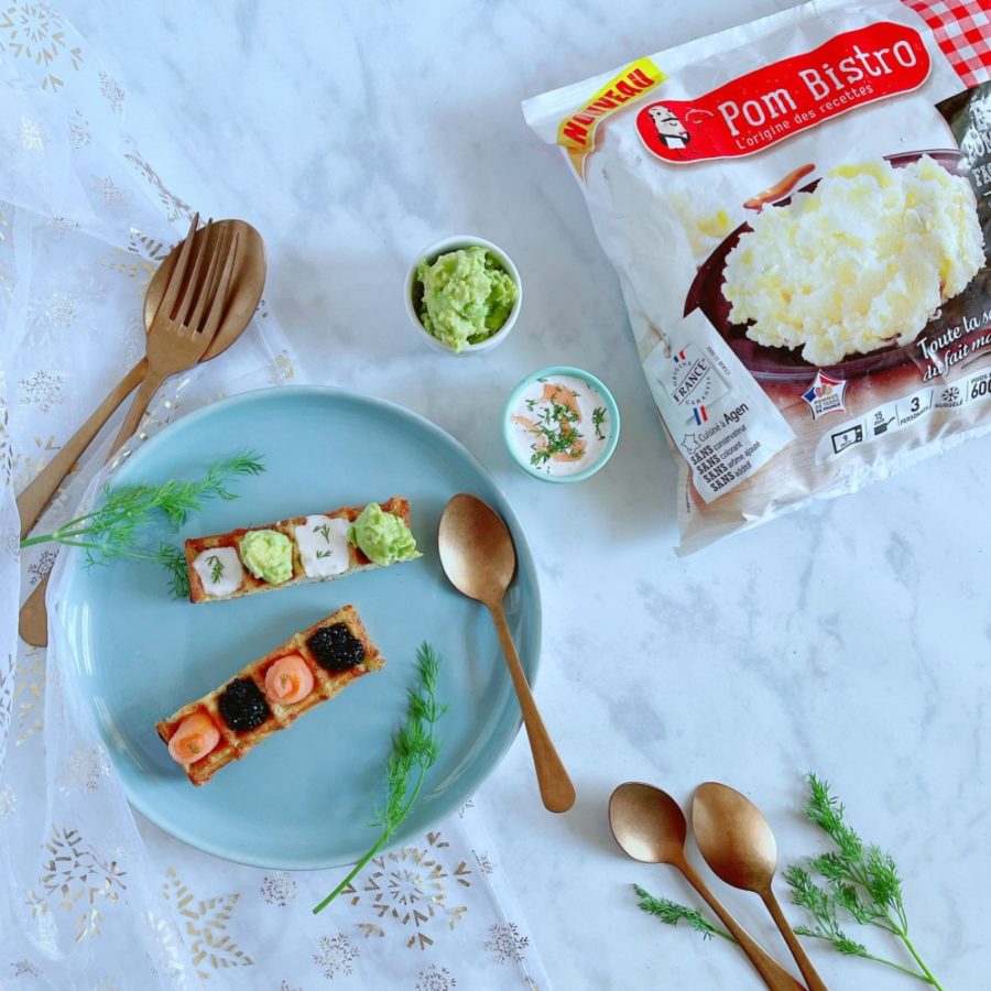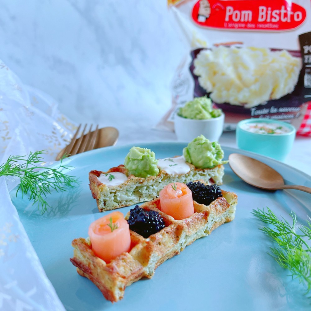 Les Mini Gaufres ont été réalisées avec l’écrasé de pommes de terre, une recette hyper facile et rapide à faire pour les fêtes de fin d’année. Elles sont parfumées à l’aneth et garnies avec une préparation au saumon, un écrasé d’avocat et des œufs de lompes. Un apéritif qui va bluffer vos convives. Place à la préparation de mes Mini Gaufres garnies pour l’apéritif avec Pom Bistro