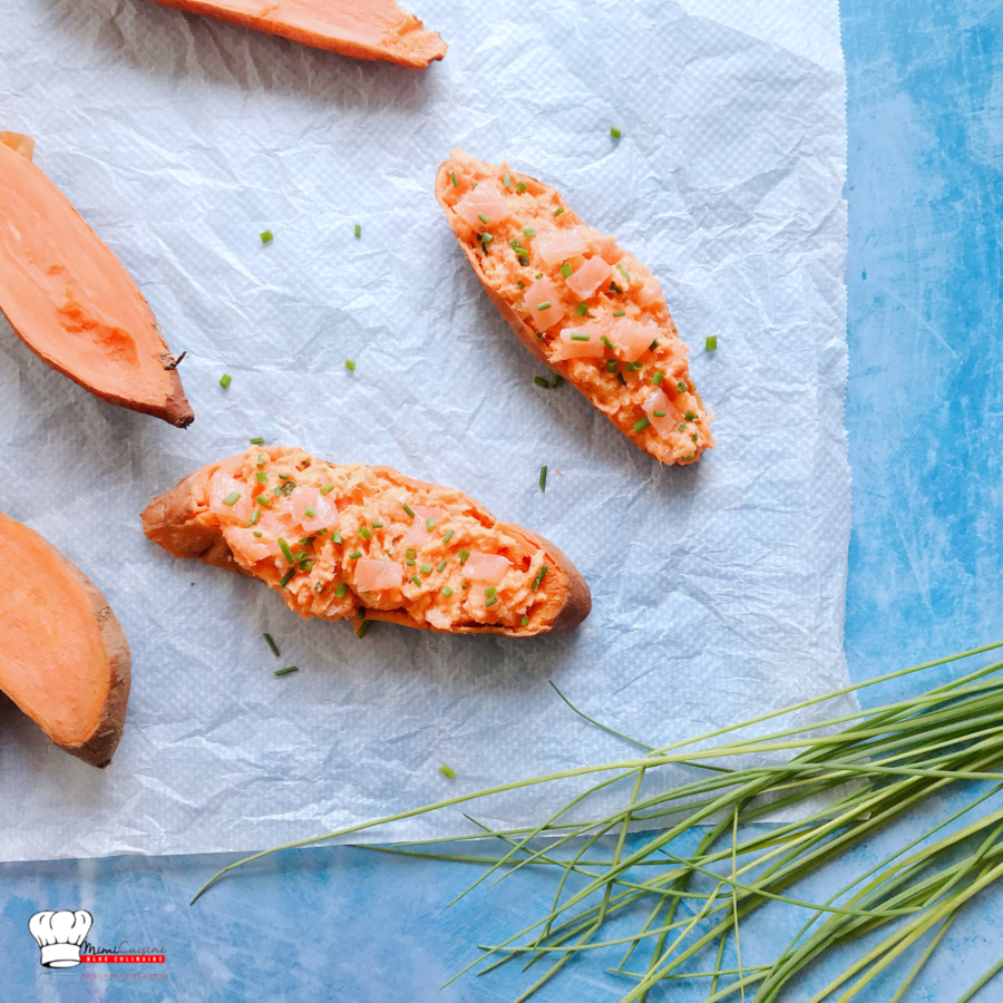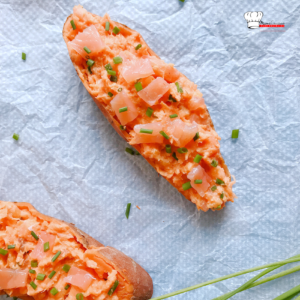 Recette à base de patate douce au Cookeo. Assez originale et succulente, vous allez adorer le mélange entre la chair de patate douce, le saumon, le fromage frais, les cerneaux de noix et le cheddar. La patate douce a beaucoup de bienfaits nutritionnels, riches en fibre, en fer et en vitamine. Outre ces bienfaits, c’est un aliment délicieux à consommer. On peut l’utiliser ou la remplacer dans nombreux plats à la place des pommes de terre. Place à la préparation de ma recette de Patate douce farcie au saumon Recette Cookeo. C’est une recette issue de mon livre « Mes recettes de saison au Cookeo » des éditions Larousse.