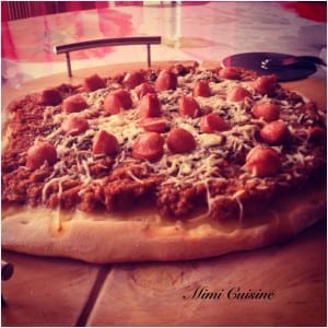 Ce soir c’est Pizza bolognaise knacki râpé Recette Thermomix et maison s’il vous plait ! Retrouvez la recette de la sauce bolognaise : ICI