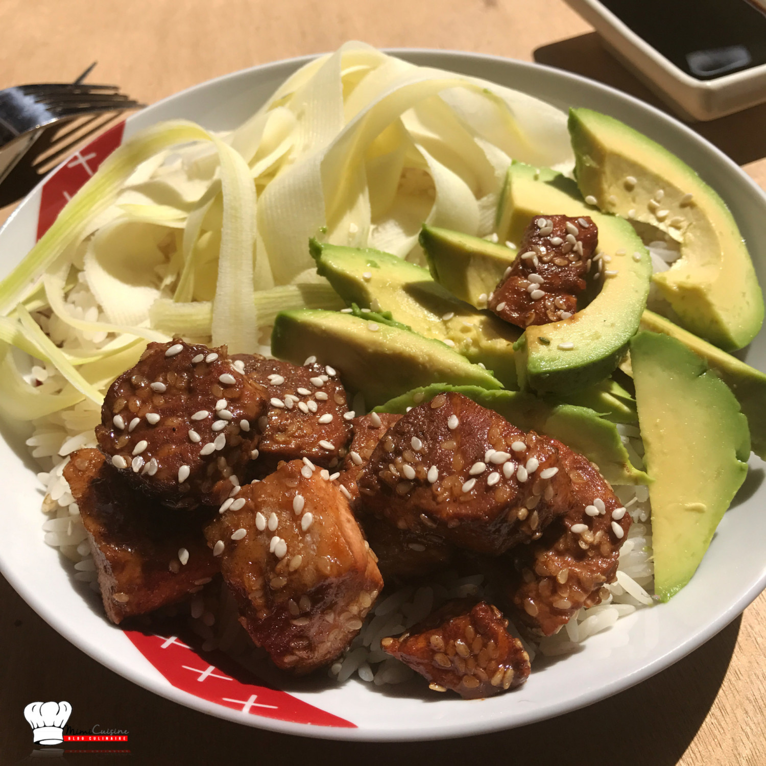 - Dans un bol ou une assiette creuse, placez le riz, puis posez dessus le saumon, les tagliatelles de courgette, l'avocat. Arrosez avec le jus de cuisson du saumon et un filet d'huile d'olive.