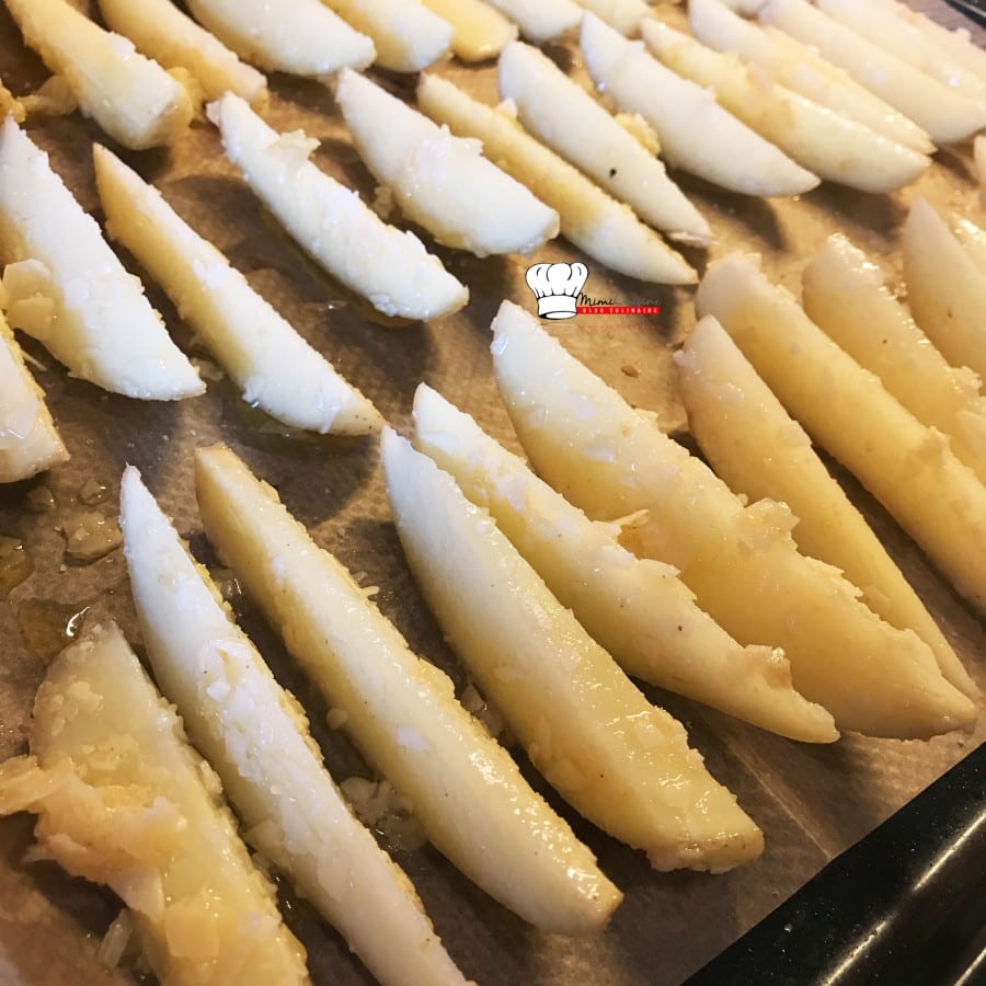 - Mélangez les pommes de terre avec l'huile d'olive, l'huile de tournesol, l'ail en poudre, le parmesan râpé