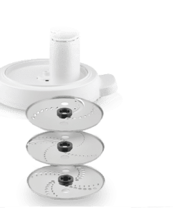 Râpe vendu séparément au prix de 100€. Elle se compose de 3 disques pour trancher, râper ou découper des crudités ou des légumes