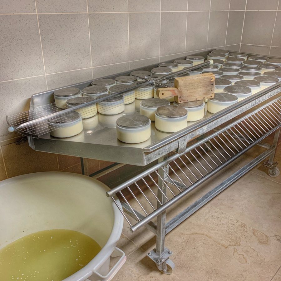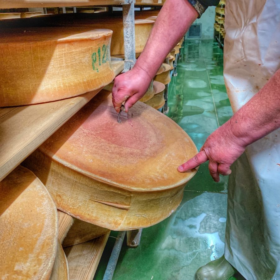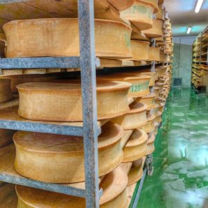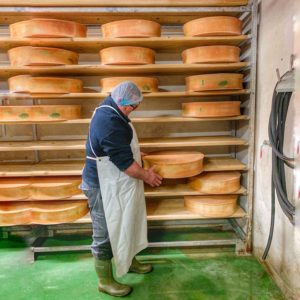 Aussi, les autres étapes de fabrication restent communes aux deux types. Le lait coagule sous l’action de la présure pour former un caillé ; le caillé est découpé en petits grains ; les grains de caillé sont versés dans les moules et pressés avec un poids pour l’égoutter. Notons que c’est à cette étape que la pastille de caséine est posée. Puis vient l’étape du salage, en saumure ou à sec. D’autre part, avant de retourner sur les planches pour finir d’égoutter et passer à l’affinage de minimum 15 jours en cave.