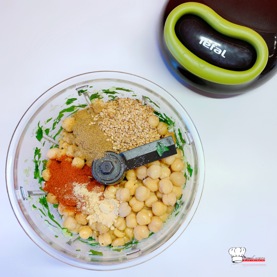 - Placez les pois chiches, le gingembre, le cumin, le paprika, les graines de sésame, sel et poivre.