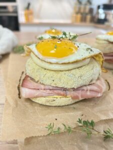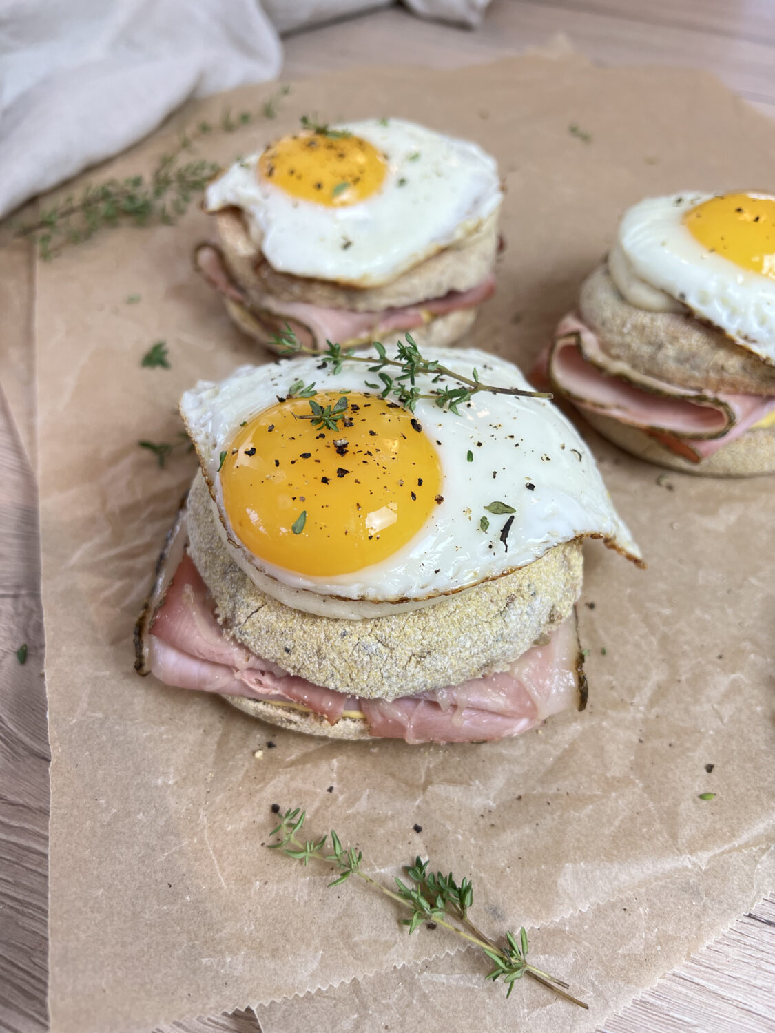 Aujourd’hui on revisite un classique avec la recette du Madame Egg McMuffin. Si vous êtes plutôt salé le matin ou que vous avez envie d’un brunch copieux, c’est la recette idéale. C’est une variante du croque-madame car à la place du pain de mie, on va utiliser des muffins, ces petits pains anglais si moelleux. Le Madame Egg McMuffin, c’est du fromage gratiné, un bon jaune d’œuf coulant et une onctueuse sauce béchamel, qui saura satisfaire même les plus gourmands. À déguster chaud avec une bonne tasse de café (ou toute autre boisson chaude de votre choix) pour un petit-déjeuner salé. C’est parti pour la recette.