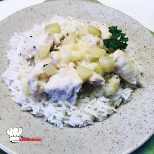 - Préparer vos assiettes, commencer par mettre le riz puis le poulet avec les kiwis. Vous pouvez ajouter les kiwis mis de coter au début de la recette. Arroser de sauce au kiwi