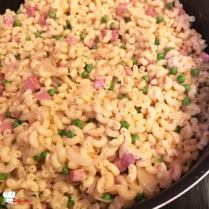 - Ajoutez les petits pois, les dés de jambon, le maïs blanc, le parmesan, le beurre restant, le sel, le poivre, mélangez et laissez chauffer encore 3 minutes