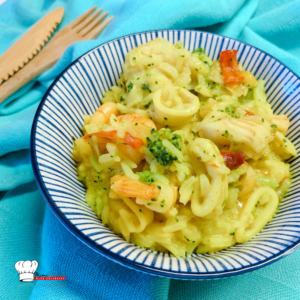 Nouvelle idée recette avec du poisson au Cookeo. Du riz, des filets de cabillaud, des crevettes, du calamar, du curcuma, du safran, et c’est parti pour un délicieux plat préparé en 30 min au robot cuiseur. Tout ce qu’on adore ! Retrouvez d’autres recettes avec du poisson sur mon blog, poisson au Curry, gratin de cabillaud et légumes, quinoa au Curry et Crevettes, blanquette de poisson. Place à la préparation de mon Riz au poisson parfumé au Safran Recette Cookeo.