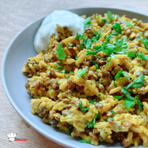 Recette du monde au Cookeo. Un délice pour les papilles ce riz libanais composé d’épices, cumin, curcuma, cannelle, de lentilles vertes, de riz blanc. Pour l’accompagner, on le sert avec une sauce au yaourt à la grecque. C’est une recette issue de mon livre « on fait quoi pour le diner au robot cuiseur« . Place à la préparation de mon Riz Libanais Recette Cookeo.