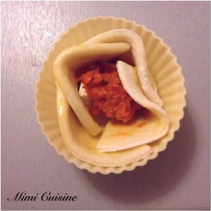 8. Au centre de chaque rond, déposer un bout de mozzarella et une cuillère de sauces apéritives